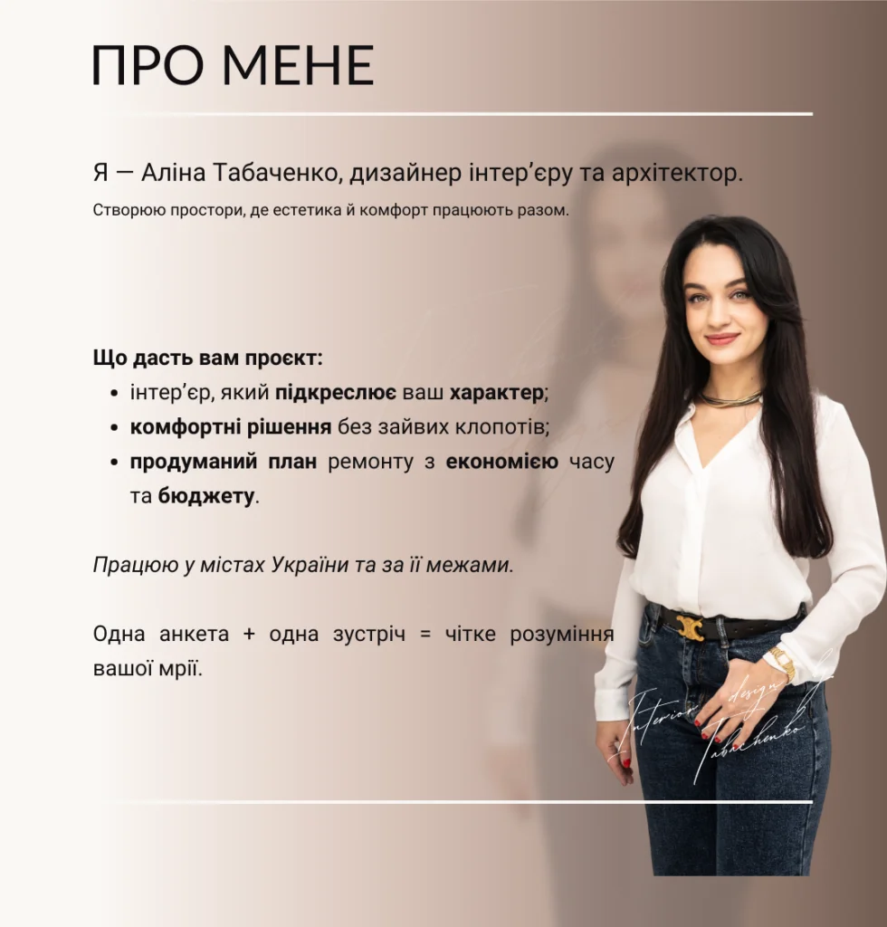 Вітаю! Мене звати Аліна Табаченко, я дизайнер інтер’єру та архітектор.